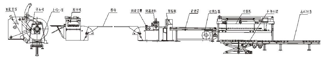 生產(chǎn)線主要由上料小車、開卷機(jī)、校平機(jī)、送料機(jī)構(gòu)、剪板輸送裝置、堆垛裝置等組成。