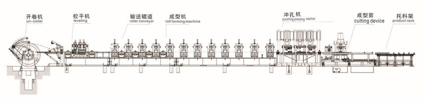 開(kāi)卷---校平----成型---沖孔---切斷---托料架