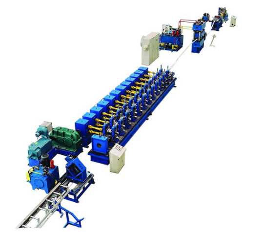 輕軌、地鐵導軌不銹鋼帶冷彎生產線由開卷機、入料導正、校平機、切頭機(對焊)、送料機、沖孔機、壓印機、輥壓成型機、成型剪、出料架、液壓系統(tǒng)、電氣控制系統(tǒng)組成,生產線速度:3-6m/min。